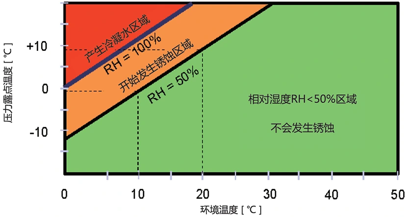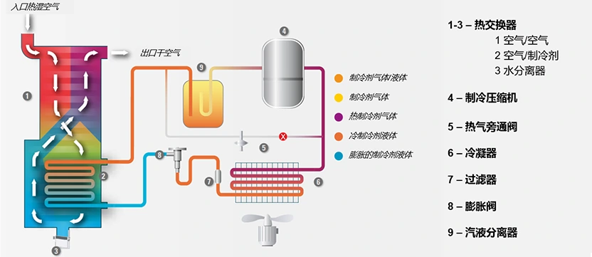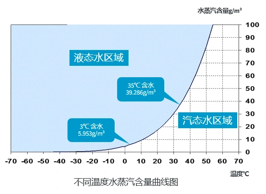 Joonis näitab, et õhk hoiab erinevatel temperatuuridel erineval hulgal veeauru. Õhk jahtub ja ka selle veeauru tase langeb. Kõveral on punktid, mis tähistavad küllastunud veeauru taset. Kõigi nende punktide temperatuur on kastepunkt. Madalam kastepunkt tähendab vähem veeauru suruõhus. Külmutatud õhukuivatid kasutavad seda füüsilist reeglit. Nad lasevad suruõhul soojust külmutusagensiga vahetada. See toiming alandab suruõhu temperatuuri. Jahutatud õhu veeaur muutub vedelaks veeks. See vedelik voolab süsteemist välja. Näiteks suruõhu küllastunud veeauru sisaldus temperatuuril 35 ℃ on 39,286 g/m³. Pärast soojusvahetust külmutusagensiga ja jahutamist temperatuurini 3 ℃ on küllastunud veeauru sisaldus 5,953 g /m³. Erinevus 33,333 g /m³ näitab pärast külmkuivati jahutamist ja dehüdratsiooni eemaldatud vee kogust. See tähendab, et pärast suruõhu läbimist külmkuivatist eemaldatakse ligikaudu 85% niiskusest, mis tagab, et suruõhu kuivatamine vastab tootmisprotsessi nõuetele.