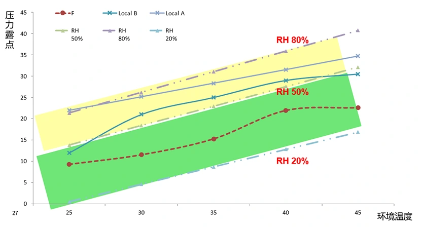 Nagu allpool toodud mõõdetud andmetest nähtub, on suruõhu sisendrõhul 7 Bar, sisselasketemperatuuril 35°C, rõhu kastepunktil 7°C ja lõplikul väljalasketemperatuuril 25°C õhu suhteline niiskus 30%, mis takistab tõhusalt torustike ja õhku kasutavate seadmete korrosiooni.