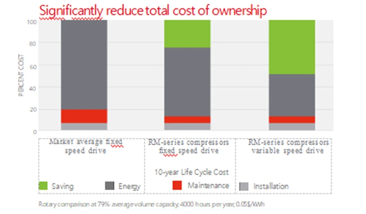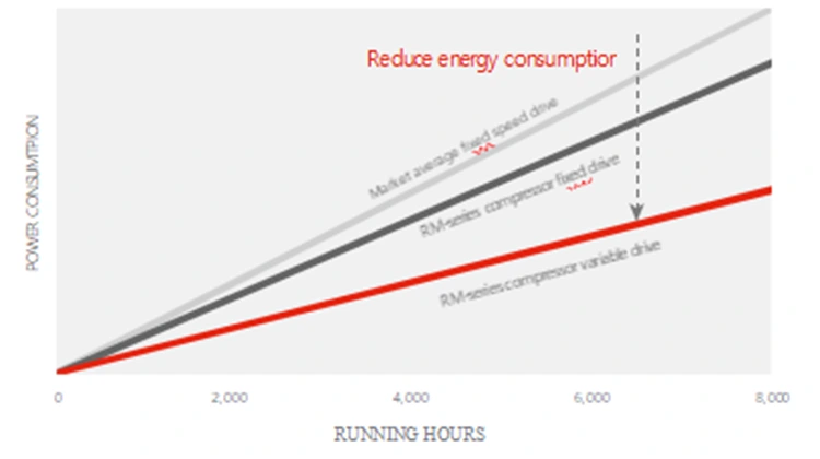 iga RM-seeria õhukompressor on varustatud uhiuue suure kasuteguriga põhiseadmega, mis ühendab IE3 fikseeritud kiirusega mootori ja ECO*-PM VSD IE5 muutuva sagedusega mootoritehnoloogia, mis aitab säästa kuni 12-30% energiakuludelt.